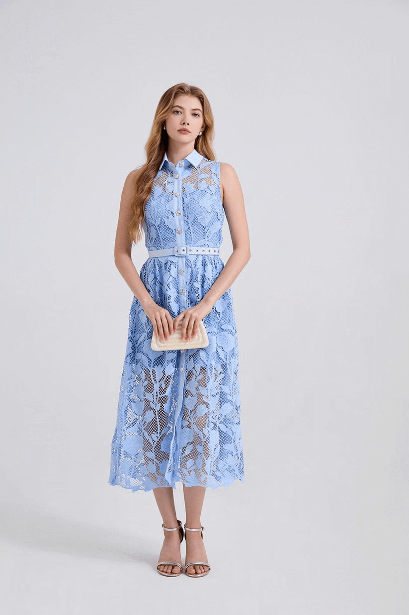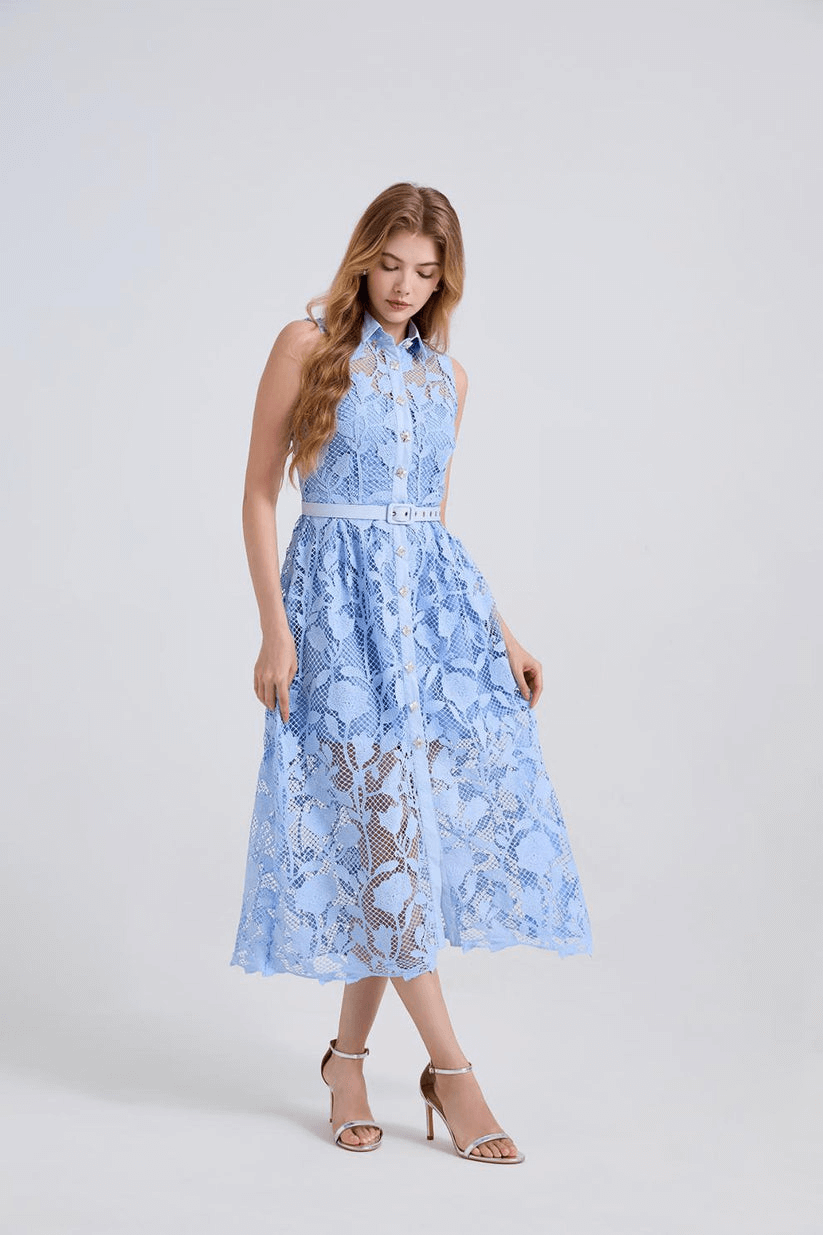 Pastel mavi tonun sakinliği ve dantelin asil dokusu bu elbisede buluşuyor.